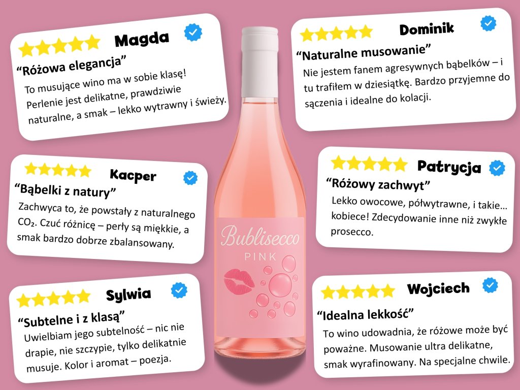 Różowe, lekko gazowane i zdecydowanie nie dla mięczaków. To nie jest wino, które ładnie wygląda i smakuje jak lemoniada. Bublisecco Pink ma styl, pizzazz i bąbelki, które powstają naturalnie - bezpośrednio z fermentacji winogron Zweigeltrebe. Bez dmuchania, po prostu uczciwy CO₂, jak robią to wielcy gracze (tak, nawet szampan).