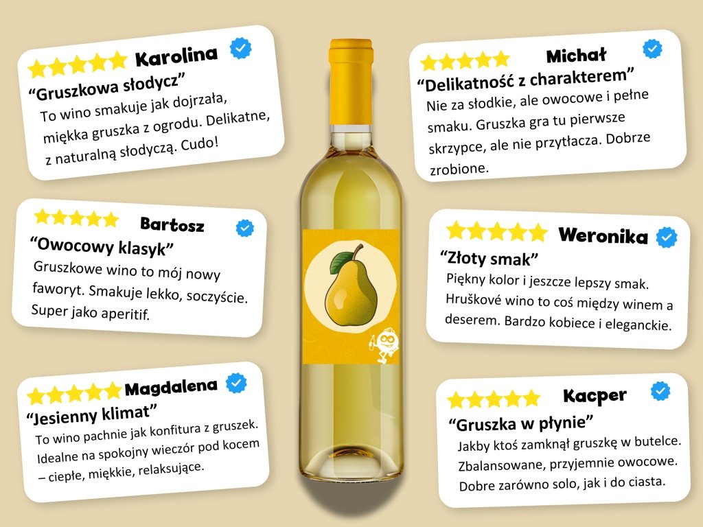Gdy tylko otworzysz butelkę, uderzy cię wyśmienity zapach gruszek. Pierwszy łyk może przypominać klasyczne białe wino, ale gdy smak się rozwinie, nie będziesz mieć wątpliwości, że masz w ustach pełno gruszek. Zanim się zorientujesz, będziesz na dnie butelki i zakochasz się w Gruszniaku tak jak my.