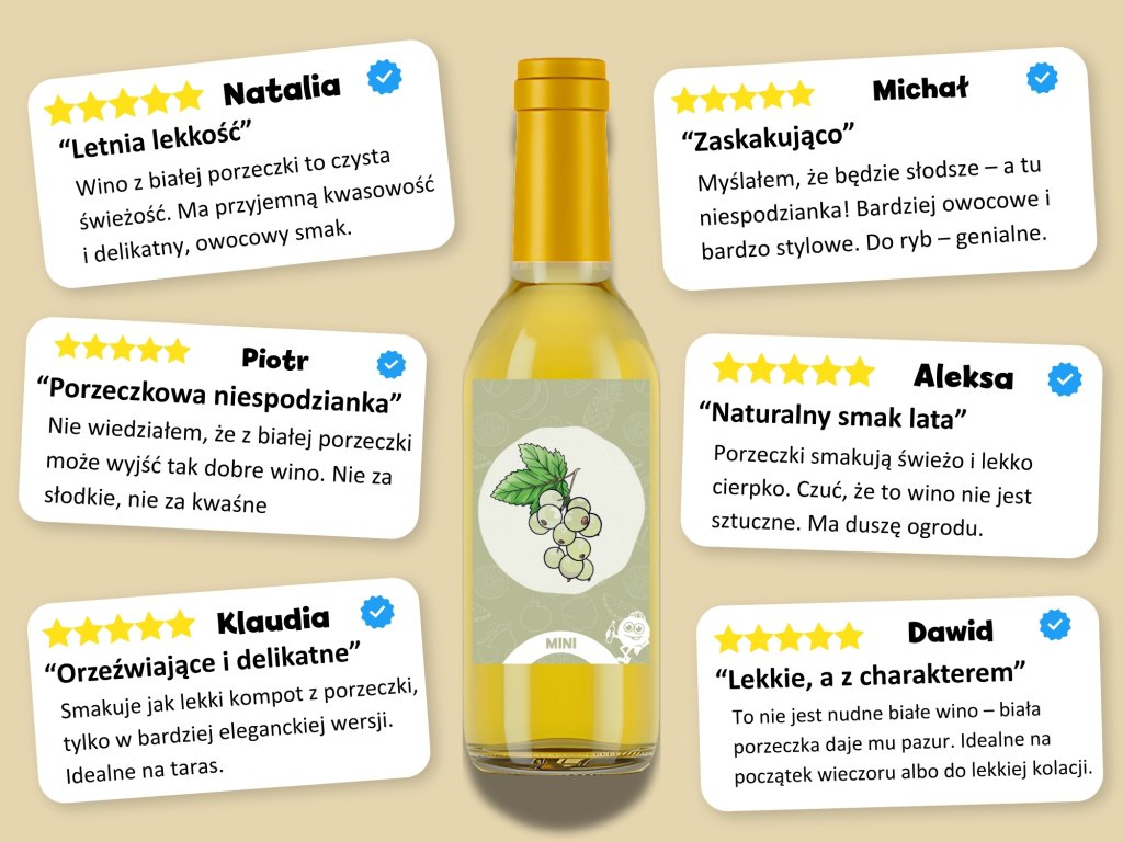 Brat naszego bestsellera, tyle że zrobiony z białych porzeczek. Wino z białych porzeczek ma wyraźny aromat, więc rozpoznasz je nawet z zamkniętymi oczami. Smakuje dokładnie jak świeżo zebrane białe porzeczki, ponieważ nie jest wzmacniane. Oznacza to, że nie dodaliśmy żadnego destylatu winnego ani neutralnego alkoholu. To owoce tworzą wino. Właśnie dlatego starannie dobieramy owoce, aby smak porzeczek był autentyczny i po prostu boski.